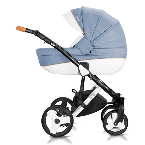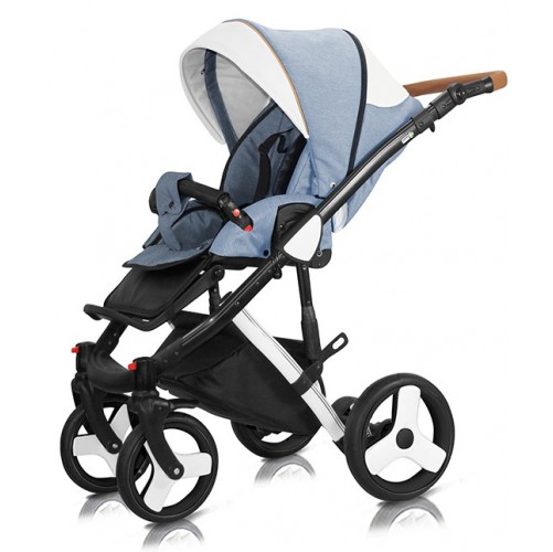 Otroški vozički z velikimi kolesi vozni po vseh talnih površinah, kolesa napihljiva. Vsi dodatni deli enostavno obrnljivi z klik sistemom.